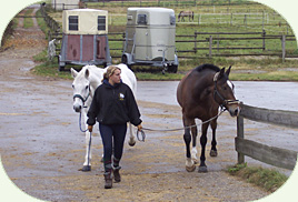 | Pferde mit Gamaschen auf Koppel bringen | |